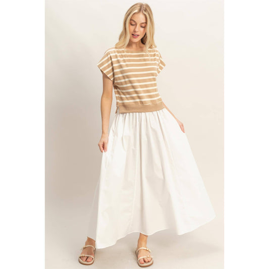 Rachel Striped Short Sleeve Midi Dress: TAUPE
