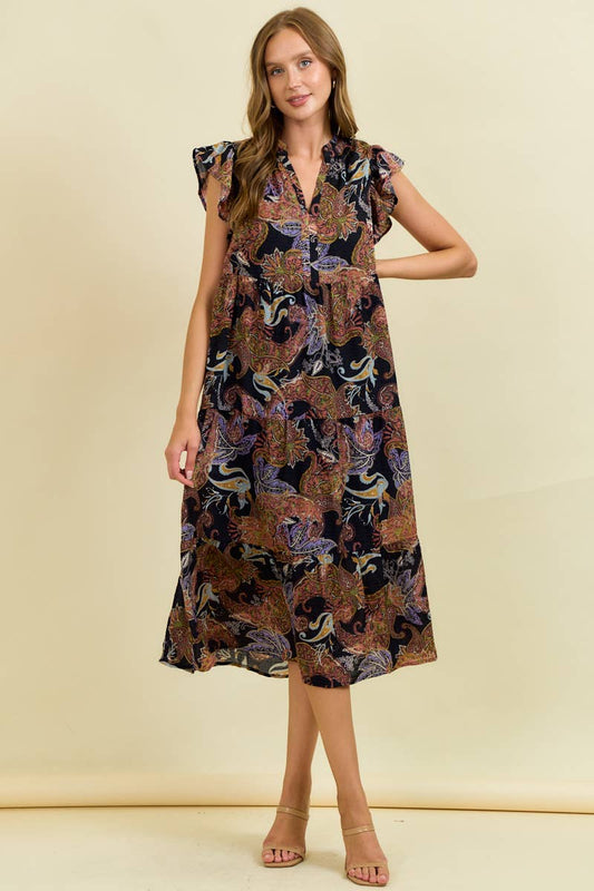 Phoenix Paisley Spit Neck Tiered Midi Dress: Black Spice