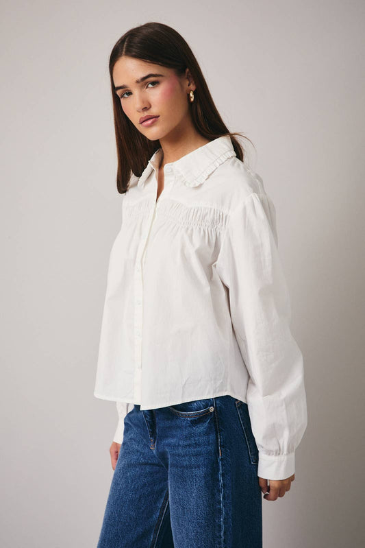 April Long Sleeve Shirring Detail Button Down Shirt: White