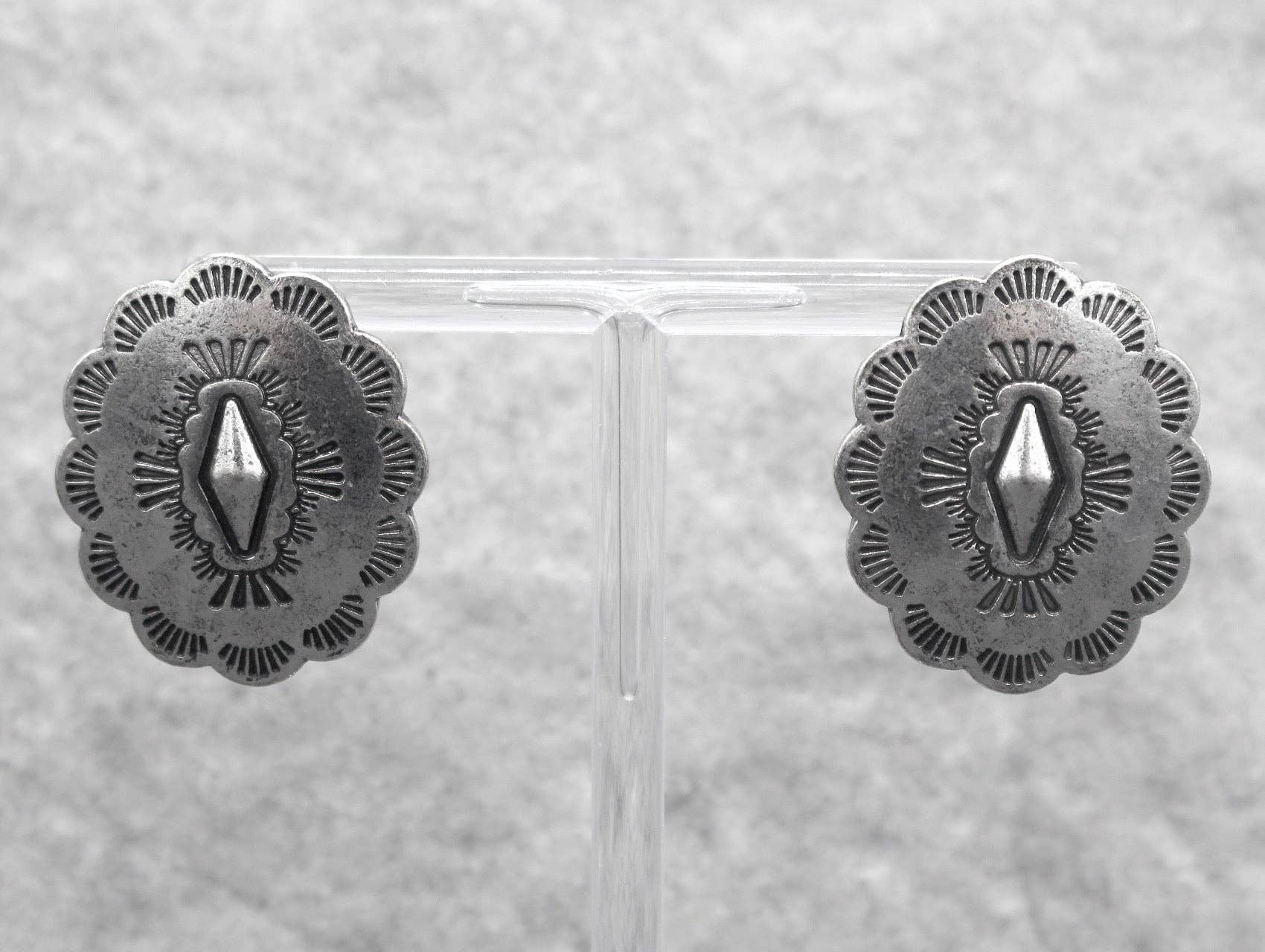 These silver metal post earrings go well with any outfit, with the simple but beautiful western texture engravings making it a more unique accessory. Complete with a post back closure.
