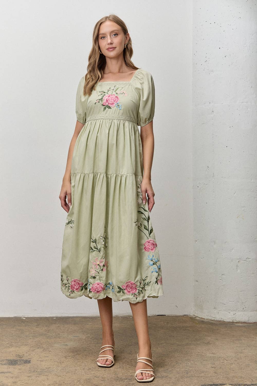 Lily Rose Embroidered Tiered Midi Dress: Sage+MIDI DRESS +SHORT SLEEVE +SQUARE NECK MODEL IS WEARING S
