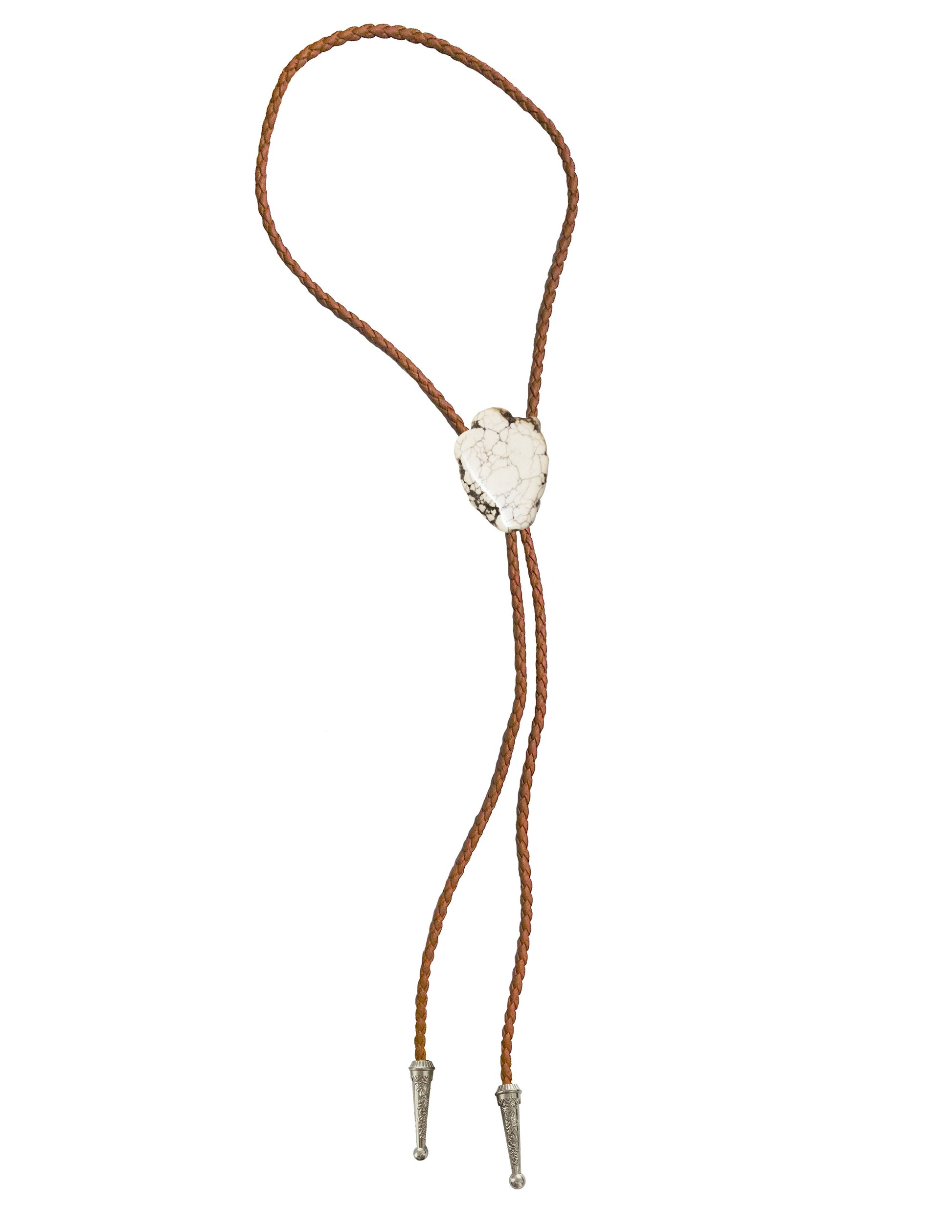 This boho western style bolo tie necklace features a white howlite gemstone on braided vegan leather with your choice of gold or silver tips. The stone slides up and down to adjust size and increase the opening to easily get the necklace on and off.