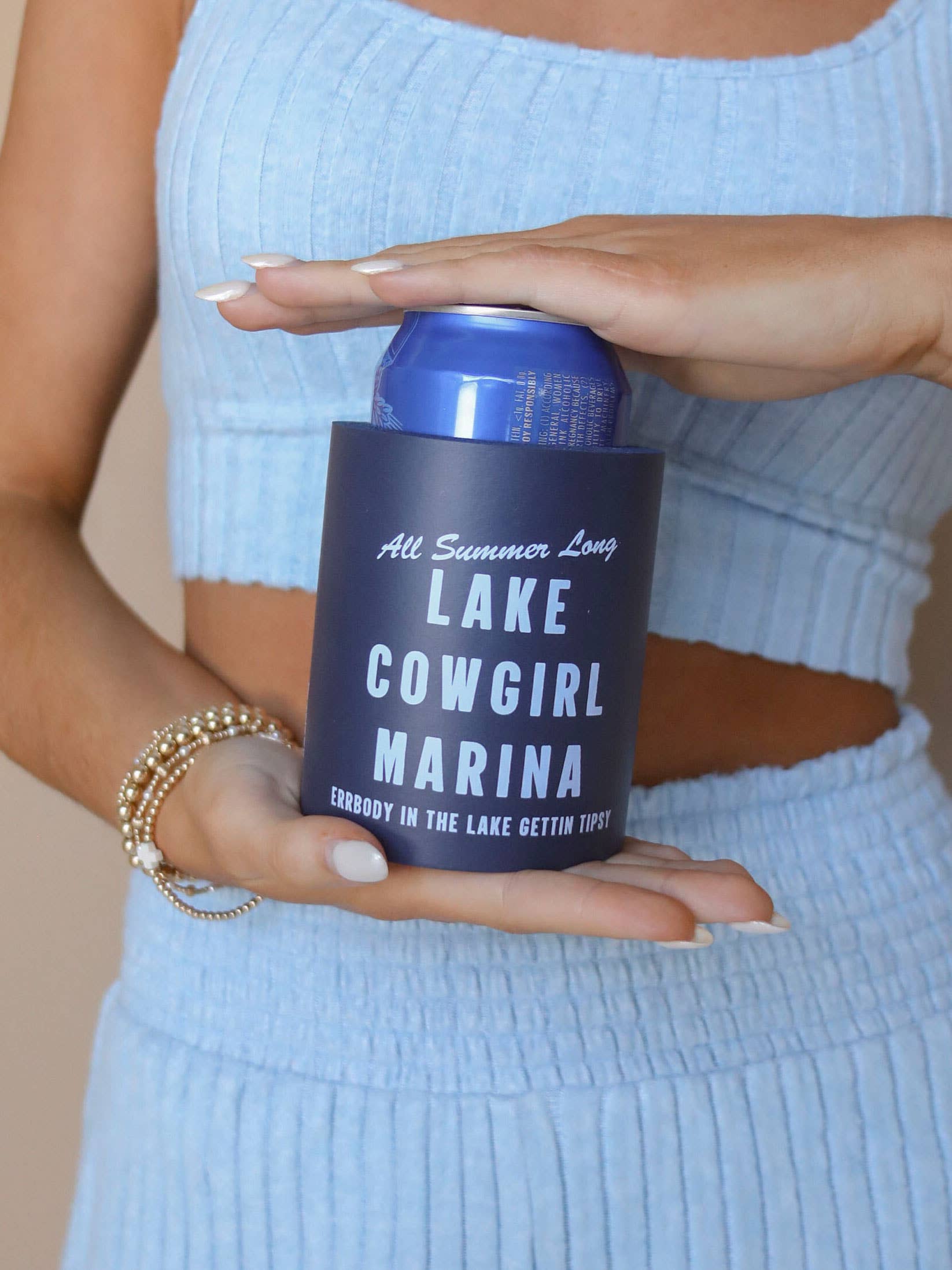 Introducing: our first ever foam koozie! This koosie will be the easiest, guilt-free, impulse purchase that will be added to every lake lover's cart. The tone on tone blue drink sleeve will be a go-to for every "lake cowgirl."