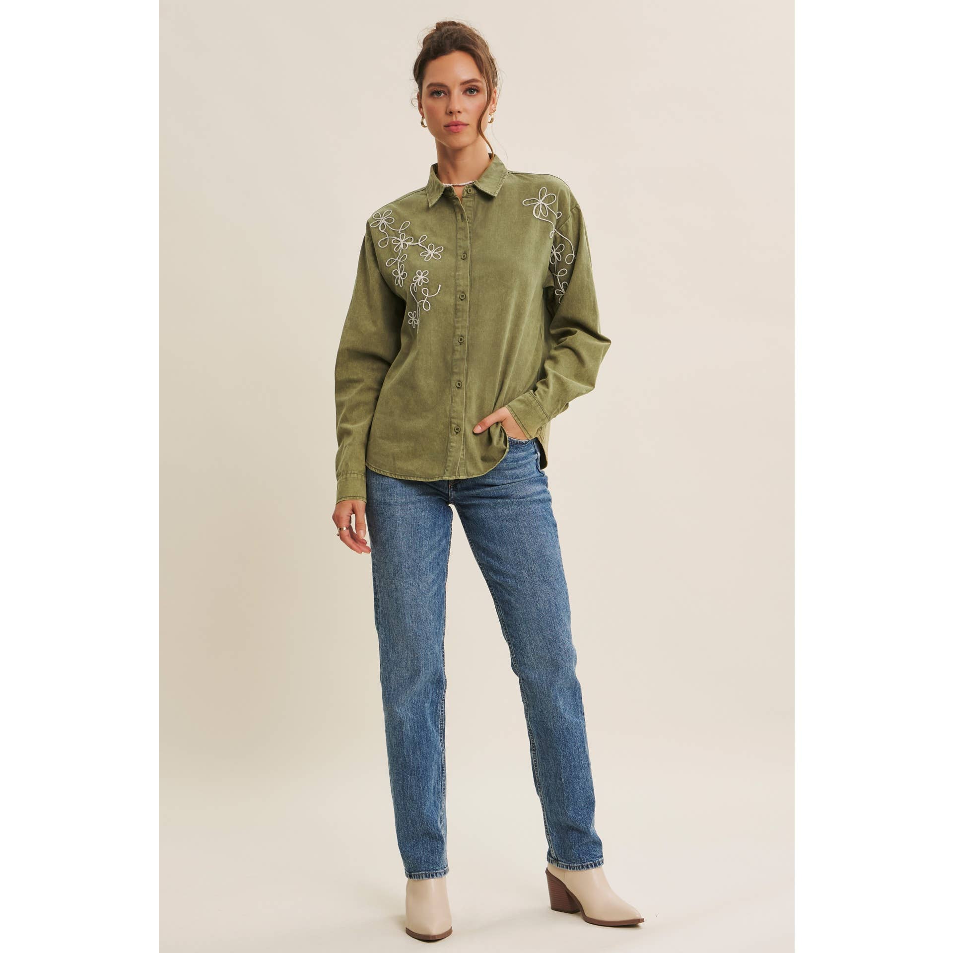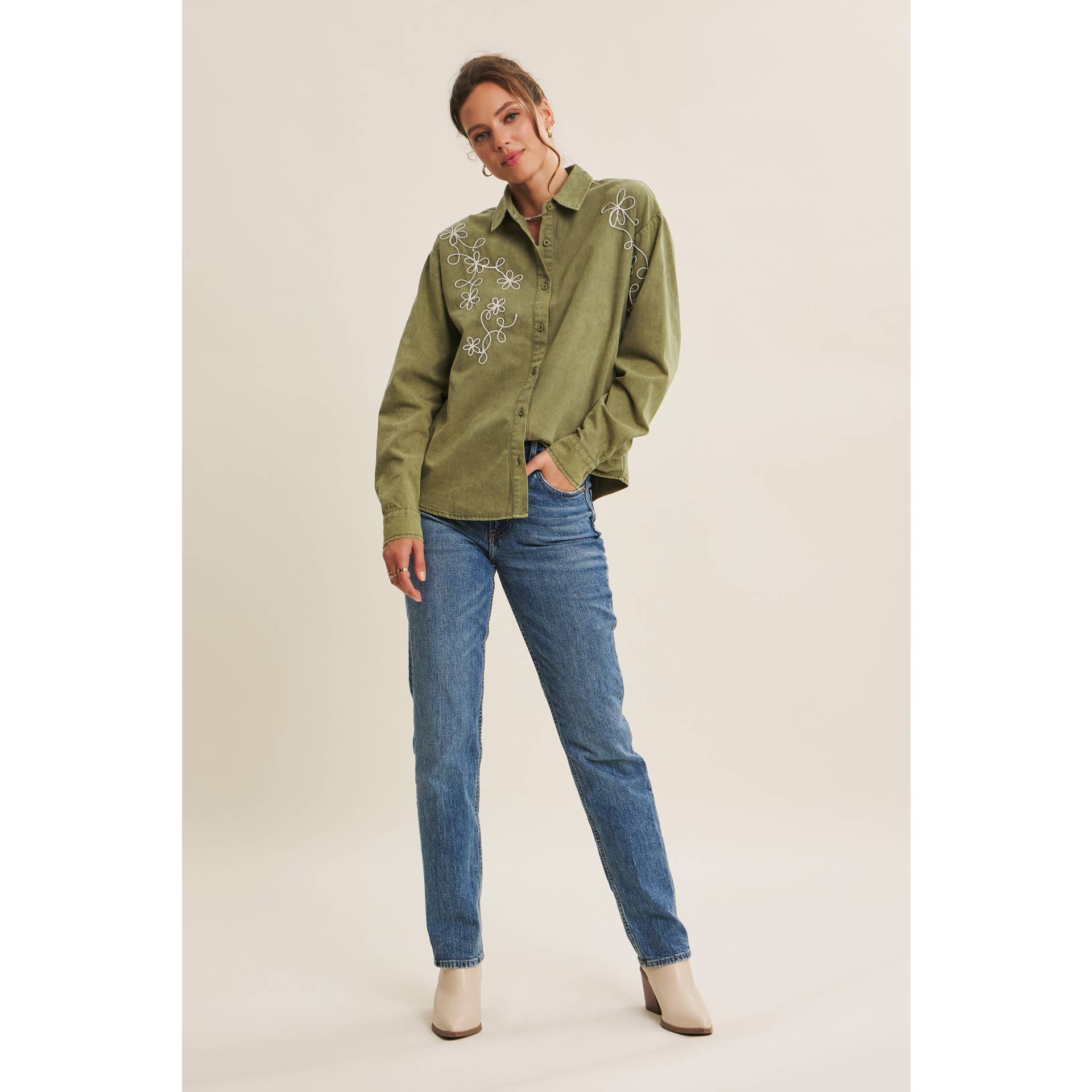 A signature shirt that blends classic heritage with a touch of countryside romance. Crafted from mineral-washed cotton, it carries a soft vintage feel that’s timeless yet fresh. The delicate floral embroidery adds an artisanal charm, elevating this shirt beyond basics into a true wardrobe statement. Designed with a relaxed fit, collared neckline, and rounded hem, it’s versatile for styling. Pair with denim for an effortless western vibe, or layer with tailored pants for a chic everyday look. Available in washed denim and vintage olive, each shade brings out a different side of its rustic elegance. A year-round staple that feels both relaxed and polished, perfect for transitioning seasons. Features - Mineral-washed cotton - Button-down shirt - Rounded hem - Collared neck - Floral embroidery - Long sleeves Size + Fit Model is 5'9.5" and wearing a size Small. Please refer to our size chart.